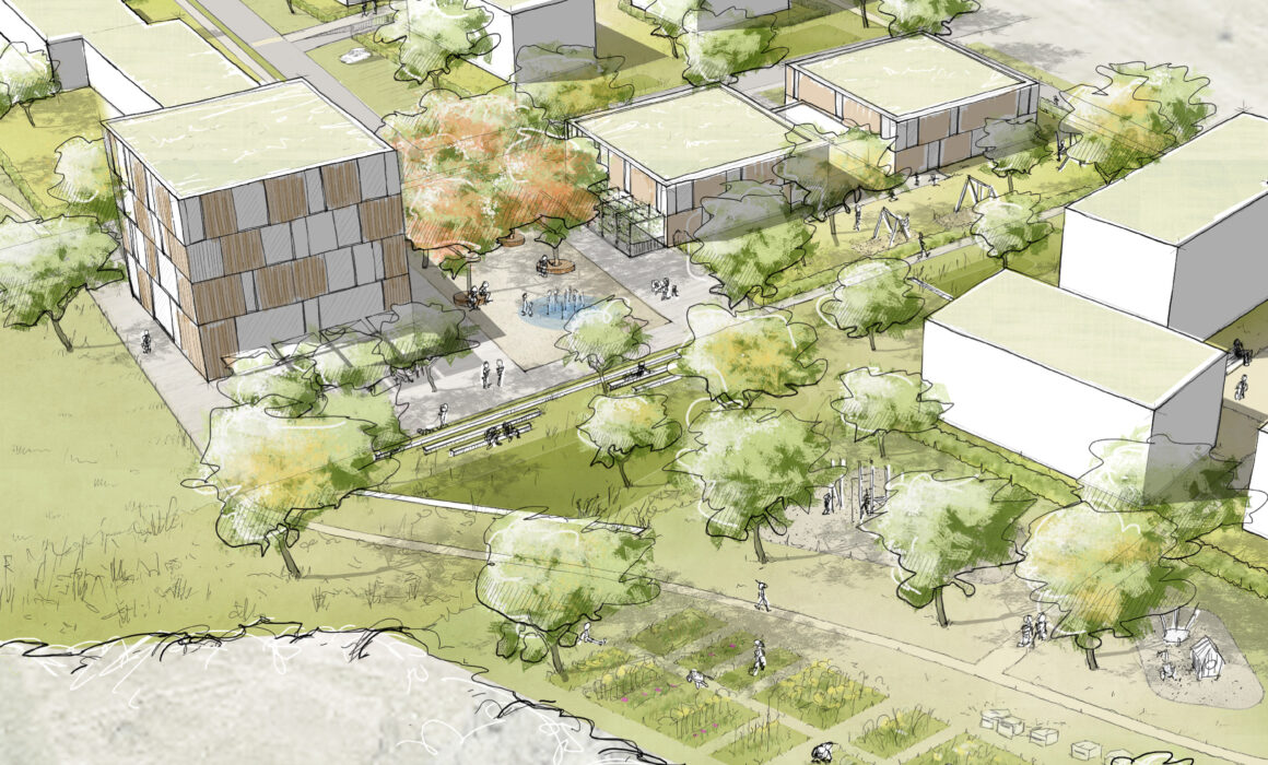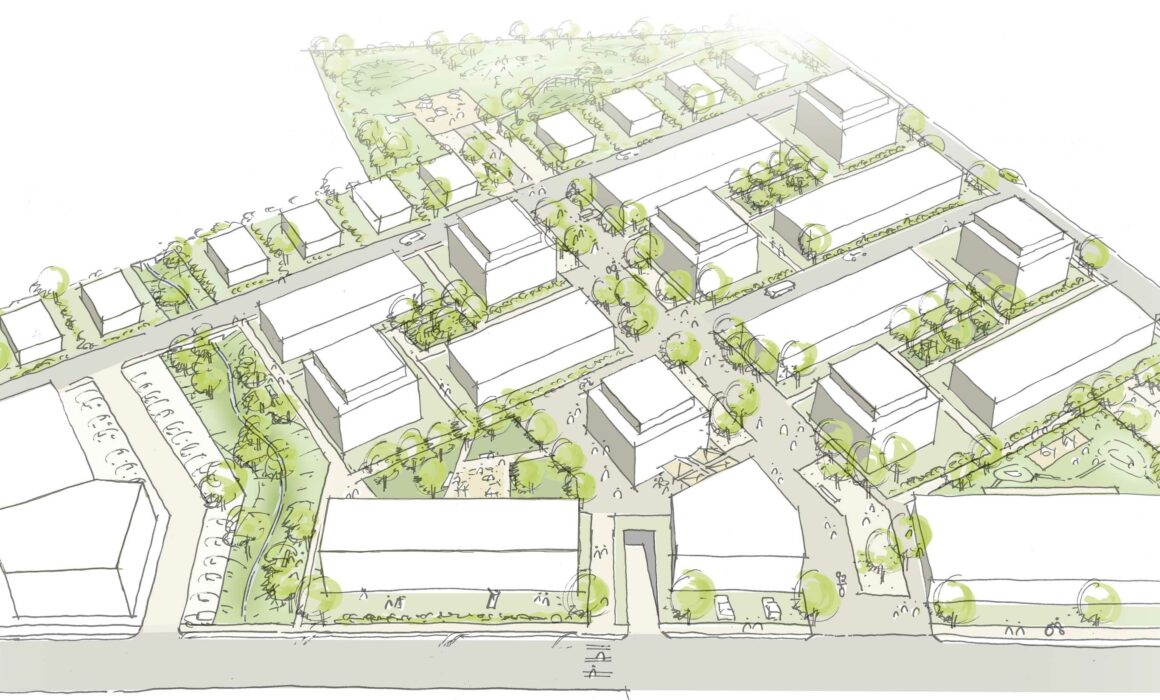 Im Quartiersinnern entwickelt sich eine Struktur aus länglichen, gereihten Gebäuden und Punkthäusern, die jeweils um Wohnhöfe arrondiert sind und eine flexible Nutzung mit guter Durchmischung unterschiedlichster Wohnformen ermöglicht. Die drei Stadt-Cluster werden durch multifunktionale Grünräume zu einem Quartier zusammengebunden, über die auch die freiräumliche Vernetzung und Anbindung des Landschaftsraumes und der bestehenden Ortsgebiete erfolgt.