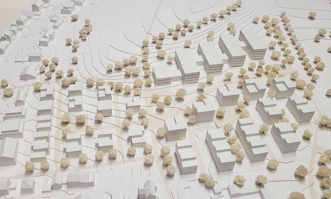 Die Topografie dient als entwurfsbestimmendes Element, entsprechend dem Verlauf der Höhenlinien entstehen drei Siedlungscluster mit individuellen Gebäudetypologien und eigener Identität. Gleichzeitig sind sie aus dem angrenzenden Bestand entwickelt und nehmen die Strukturen, Wegebeziehungen, Freiräume und Grünbezüge auf. Im Osten, angrenzend an die Krankenhausbebauung sind größerteilige, verdichtete Wohnformen im Geschosswohnungsbau vorgesehen.
